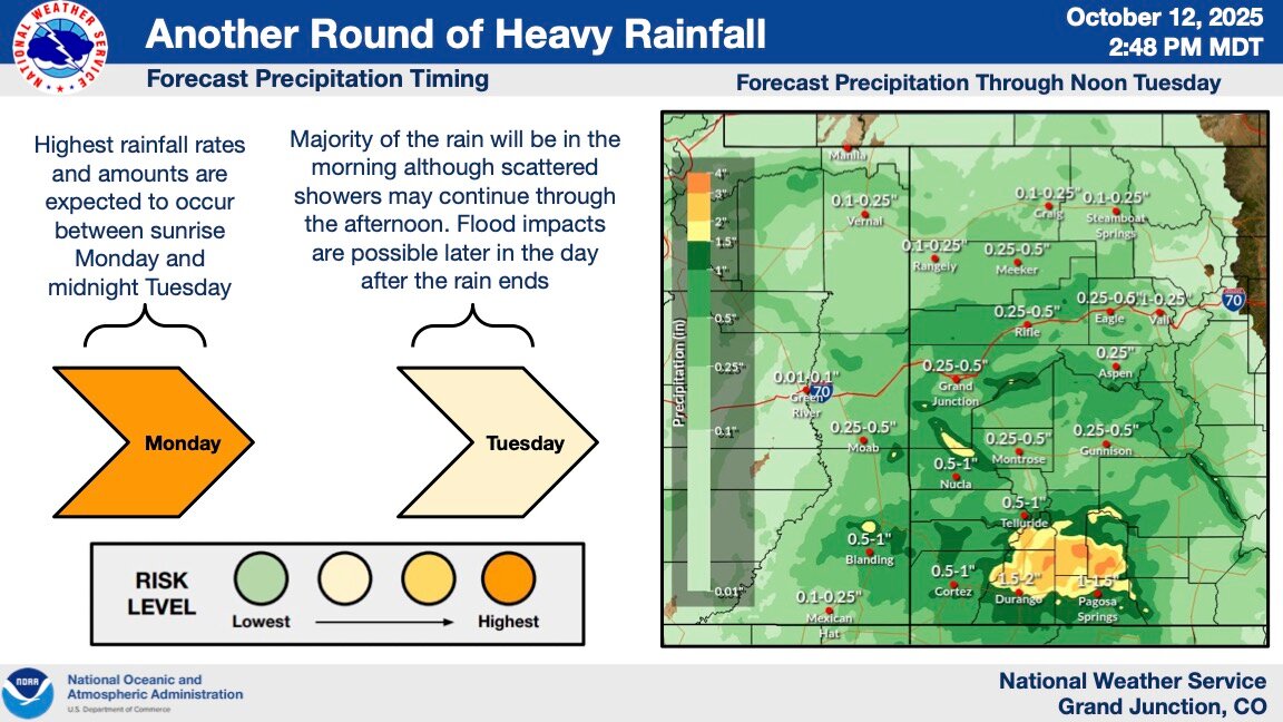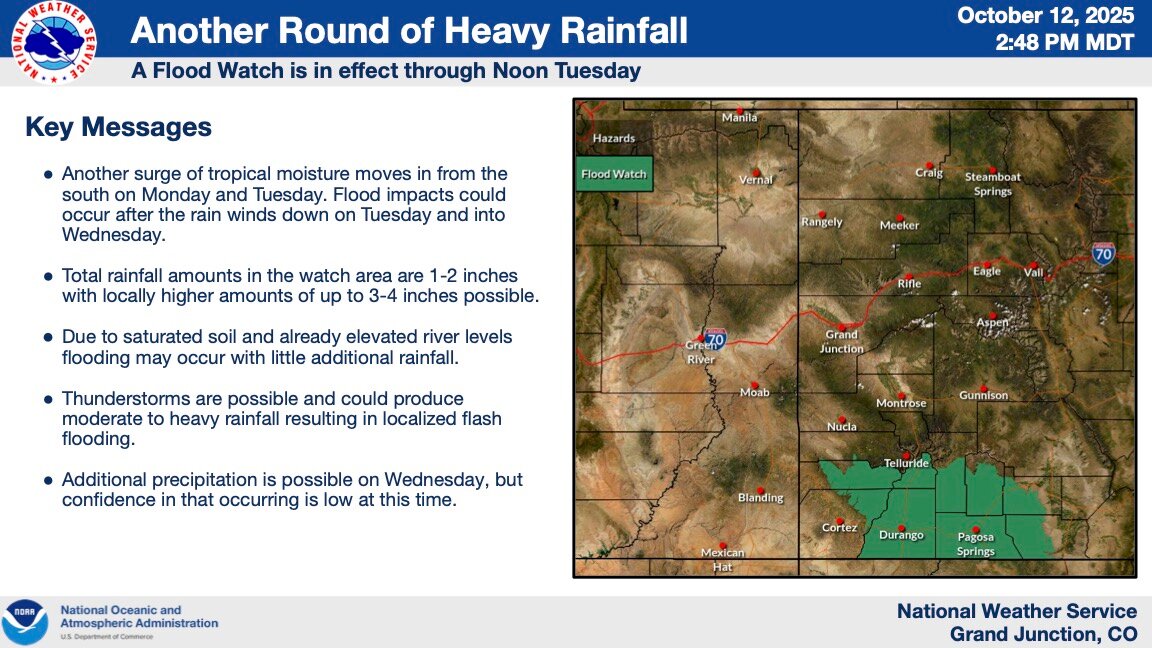 Original: The National Weather Service has extended the flood watch for Pagosa Springs through Tuesday due to another surge of moisture that is expected with the remnants of Tropical Storm Raymond.
