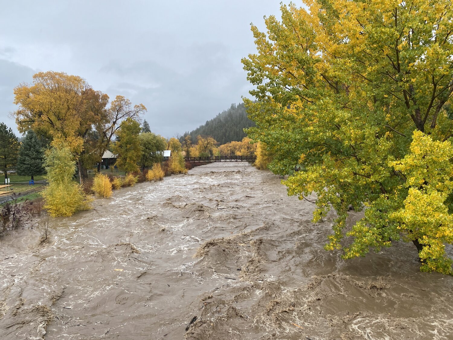 The San Juan River has surged beyond its banks and is currently flooding areas of downtown. The river is flowing at an estimated 7,200 cubic feet per second (cfs), with water levels expected to crest around 11 p.m. tonight.