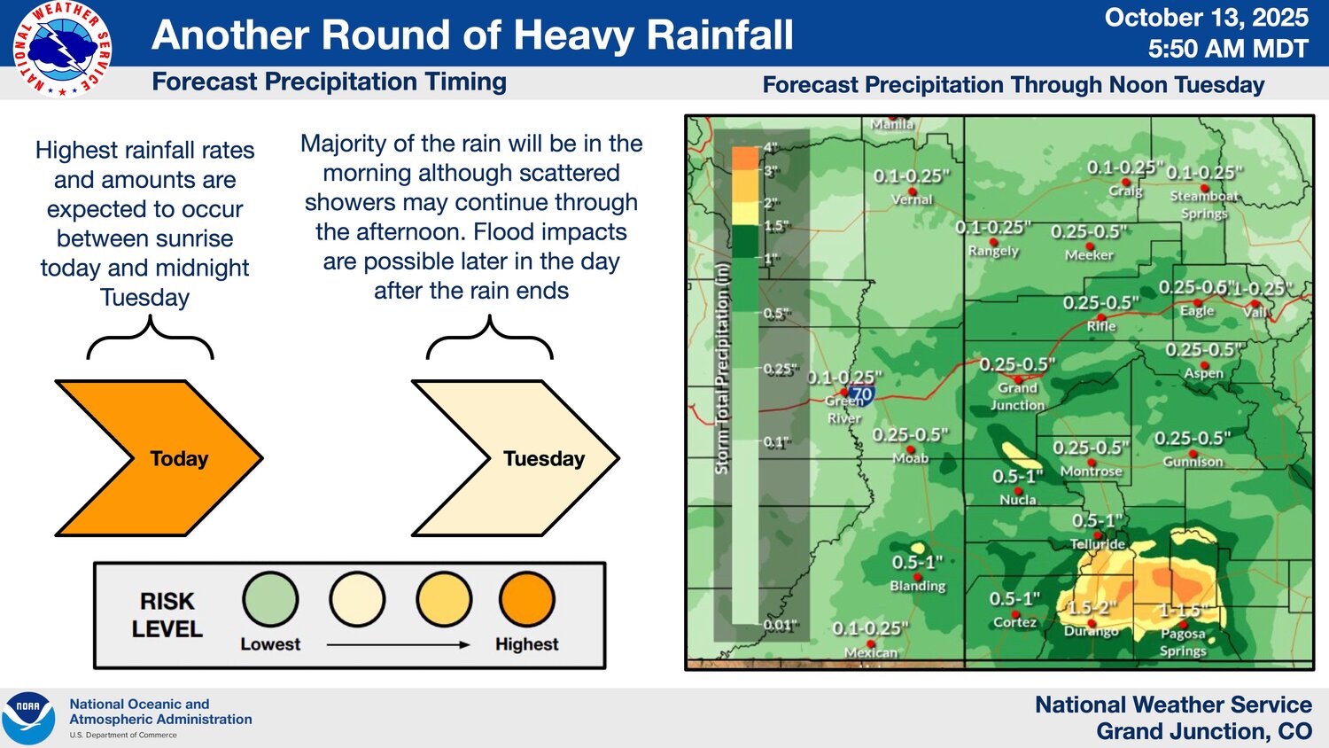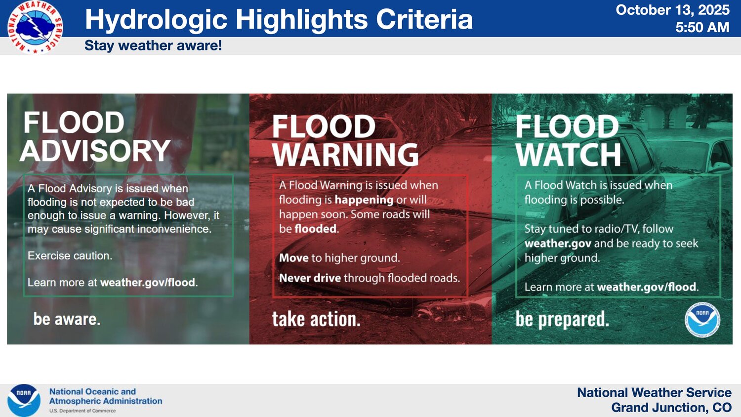 The main area of concern is Southwest Colorado and the San Juan mountains, where a flood watch is in effect. In addition, an areal flood warning near Vallecito and a flood warning for the San Juan River at Pagosa Springs also remains in effect.